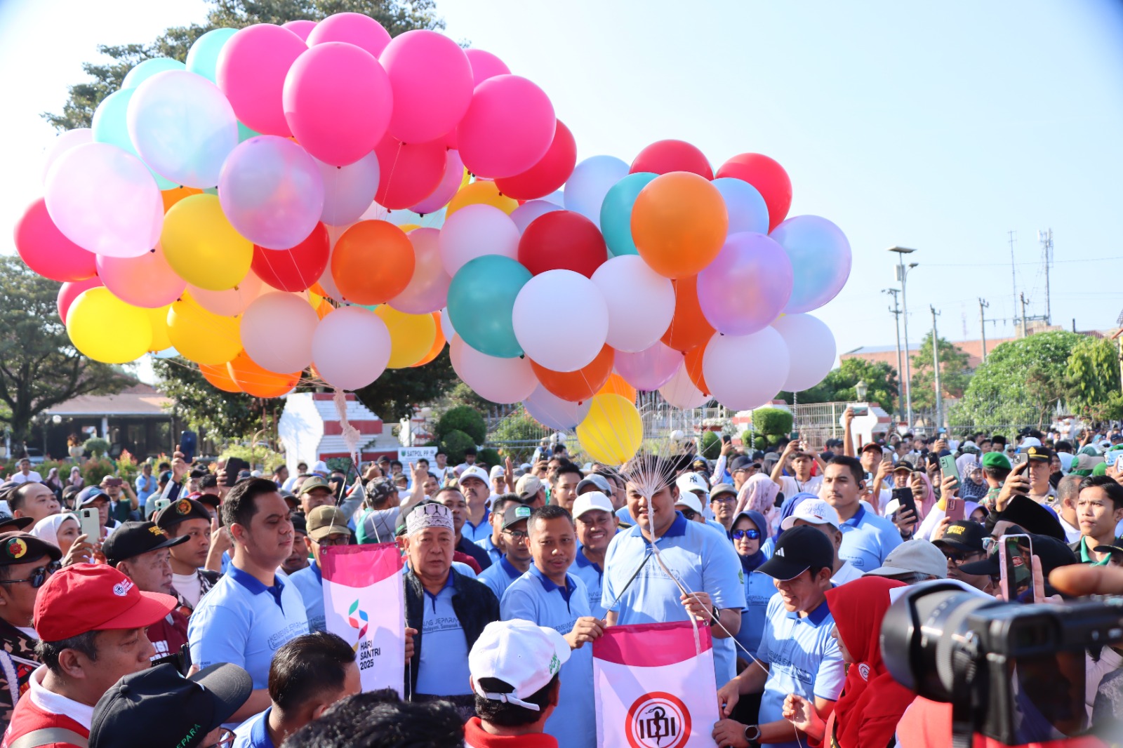 Banyak peserta yang datang bersama keluarga sambil mengenakan pakaian seragam putih-hijau khas Hari Santri, sementara anak-anak bersorak riang membawa balon bertuliskan “Santri Sehat, Jepara Hebat”.