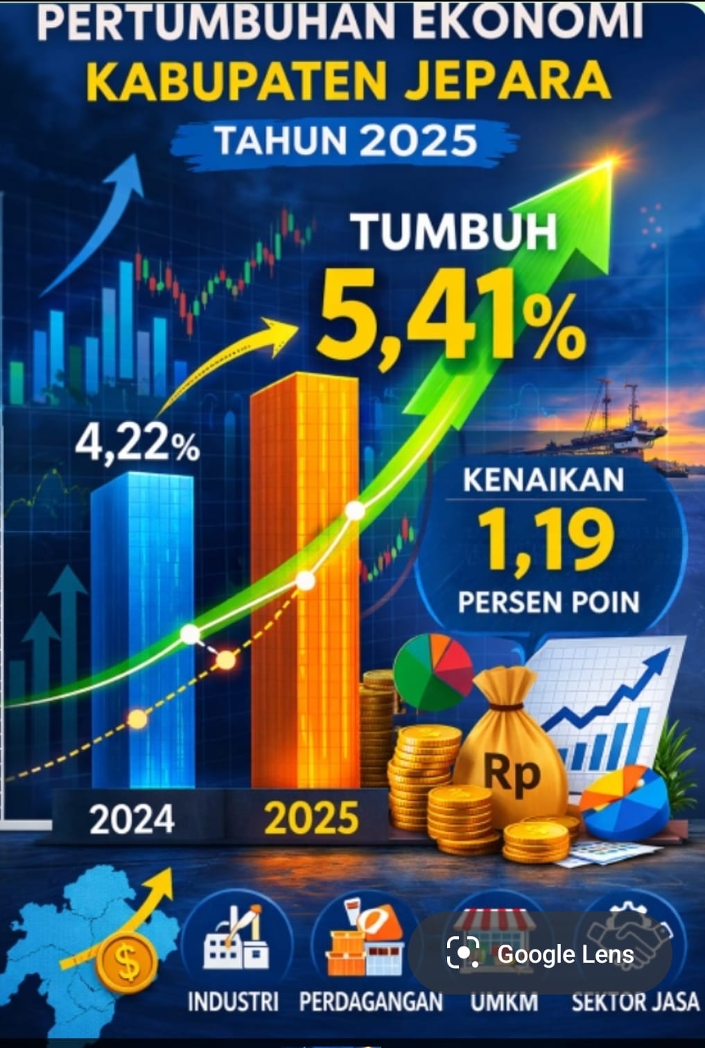 Pertumbuhan ekonomi Kabupaten Jepara tercatat naik cukup tajam dari 4,22 persen pada 2024 menjadi 5,41 persen pada 2025, atau meningkat 1,19 persen poin. Angka ini menjadi sinyal kuat bahwa aktivitas ekonomi daerah semakin bergerak, didorong sektor industri mebel, perdagangan, jasa, serta geliat pelaku UMKM.